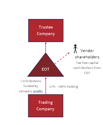 A trust is set up and the existing shareholders sell shares in their trading company to the trust for market value as determined by an independent valuer. The sale consideration will usually be in the form of cash and loans which is left as outstanding, thereby creating debt in the trust. The debt is repaid to the shareholders by the trust over a period of time funded out of future profits of the company. External funding can also be arranged to provide immediate payments to shareholders if necessary.